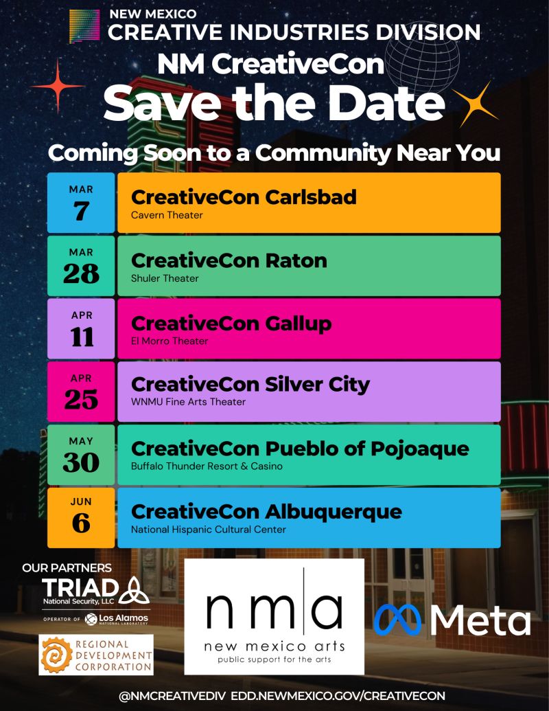 The regional events will highlight local creative assets, including historic theaters, connect attendees with state and local resources, and strengthen networks within each region’s creative ecosystem. Current sponsoring partners include the New Mexico Marketing Center of Excellence, Meta, New Mexico Arts within the Department of Cultural Affairs, New Mexico Tourism, Department of Workforce Solutions, Triad National Security LLC, Regional Development Corporation of Northern New Mexico and several local Mainstreet organizations.